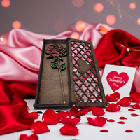 This beautiful laser-cut wooden box is like a secret treasure chest! It has an amazing design with a fancy pattern cut into the lid and a sweet heart shape in the middle. Inside sits a gorgeous wooden rose with red/pink petals and green leaves that fits perfectly in its own special spot.