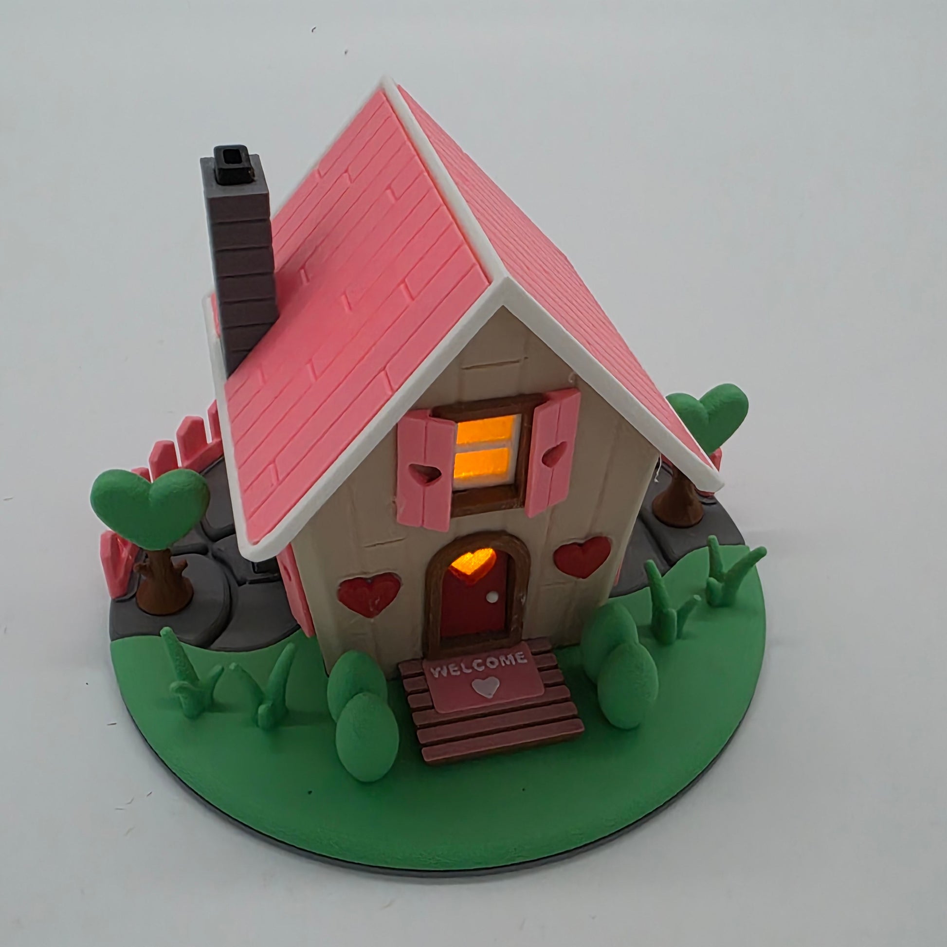 There's a cool stone pathway that goes around the house with a pink fence, and in the middle sits a glowing tealight that makes everything look super magical. Plus there are heart-shaped trees and a chimney on top!